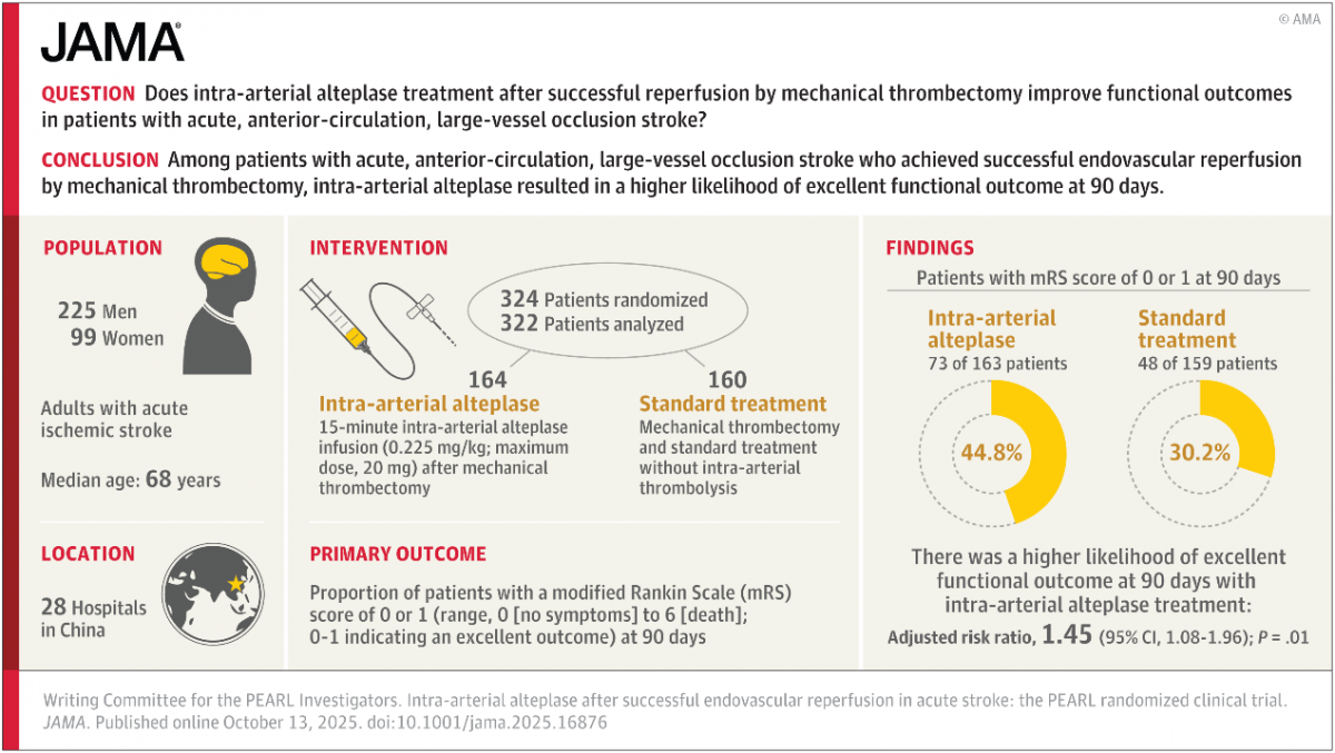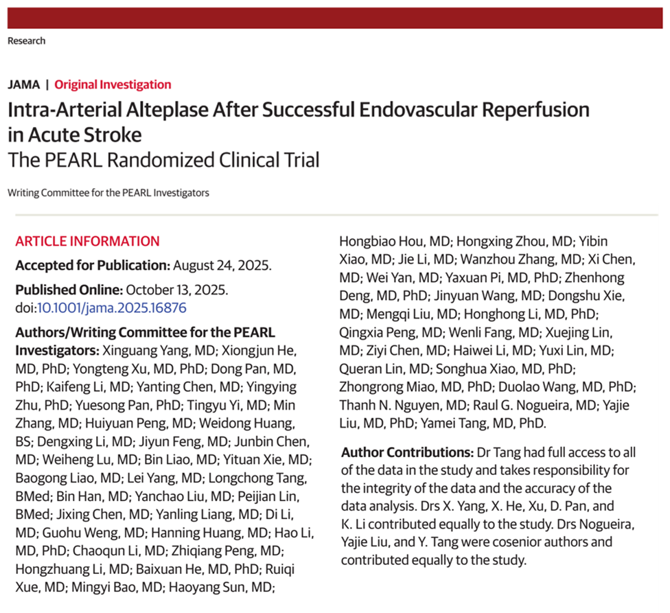2025年10月13日,由我院唐亚梅教授团队牵头发起的PEARL研究(Intra-arterial Alteplase for Acute Ischemic Stroke After Mechanical Thrombectomy),以原创性研究论文形式发表于国际顶尖医学期刊《JAMA》,为全球急性卒中治疗领域提供了来自中国的高级别循证新证据。PEARL研究聚焦急性前循环大血管闭塞患者血管内治疗再通后预后不理想的临床难题,通过大规模多中心随机对照研究设计,证实了血管再通后辅助动脉内溶栓的显著临床价值,为优化急性卒中诊疗方案开辟了新路径。