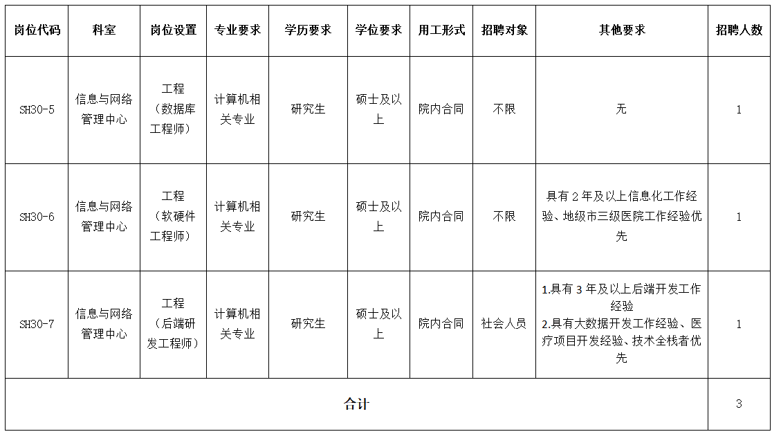 中山大学孙逸仙纪念医院深汕中心医院因工作需要,面向社会公开招聘信息与网络管理中心合同工程岗位共3名,现将有关事项公布如下:
