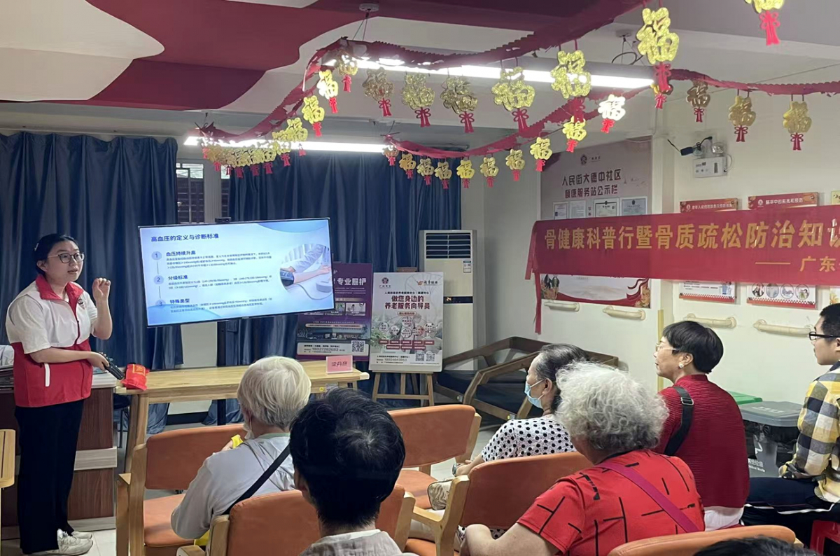 在今年的世界骨质疏松日主题活动中,这一共建机制再结硕果。10月21日上午,药学部团支书梁丹彦药师前往越秀区人民街社区服务中心,开展骨质疏松专题药学科普讲座。围绕“三高预防与疼痛缓解”,她结合居民的饮食与运动习惯,生动讲解了高盐饮食对骨骼的影响、适宜运动对骨密度的提升作用,以及三高合并骨质疏松患者的用药注意事项。