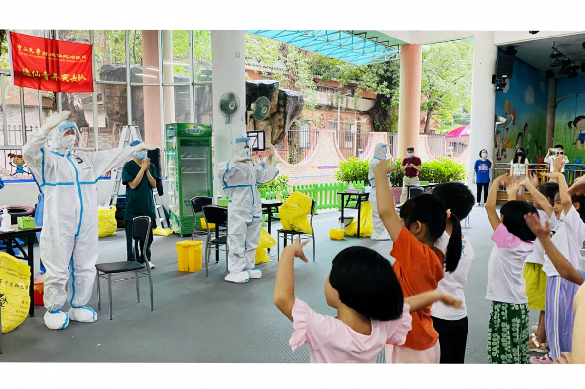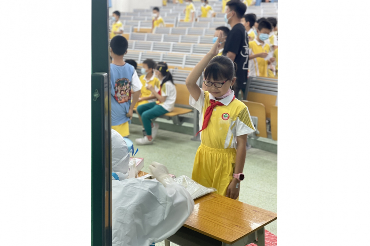 4日上午,我院派出30人核酸采样医疗队前往中山大学附属中学、附属小学和附属幼儿园支援核酸采样工作。在中山大学附属小学,孩子们不仅非常配合采样工作,还送上自己手绘的明信片向队员们表达感谢。