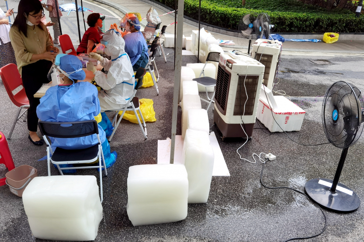 在核酸采样工作现场,热心市民送来的“清凉礼物”堆成了一座小山,采样队员罗建伟护师表示,开展工作以来,许多热心市民为采样队送上消暑饮品,更有市民亲自到冰场采购了冰块,在驻点周围堆起“冰块阵”,为采样队员消暑降温。