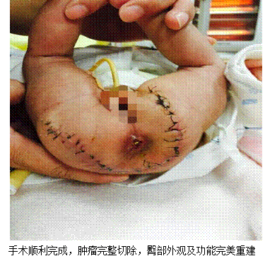 9月20日,在麻醉科王志教授团队的支持下,邓小耿主任及其团队为小意施行了手术。经过3个多小时的手术,成功将小患儿的肿瘤与周围的泌尿生殖道、直肠肛管分离,并避开了骶尾部和双下肢重要的血管和神经,将巨大的肿瘤精准、完整地切除,同时对臀部、会阴部的外观和功能进行了修复重建。小意切除肿瘤后体重仅有1.6kg,而切除的肿瘤约15cm×11cm×10cm大小,重达1.1kg,肿瘤几乎占了自身体重的70%。整个手术过程顺利,出血不到100ml,拔除气管插管后患儿发出了响亮的哭声,各项生命体征稳定。随后小意被转入SICU进行密切监护治疗。现在患儿病情稳定,伤口I期愈合,哭声响亮,吃奶有力,排便排尿通畅。