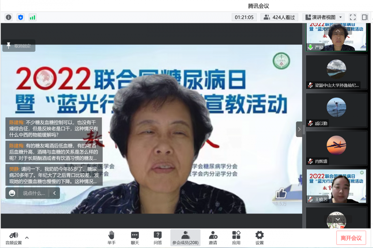 直播间中气氛热烈,糖尿病患者和家属争相提问,线上答疑将活动推至高潮。专家教授根据大家提出的问题进行了分析,结合自己的经验,给出了详尽的建议,听众们纷纷表示受益匪浅。本次活动线上参会人数达到424人,获得“点赞”超万次。