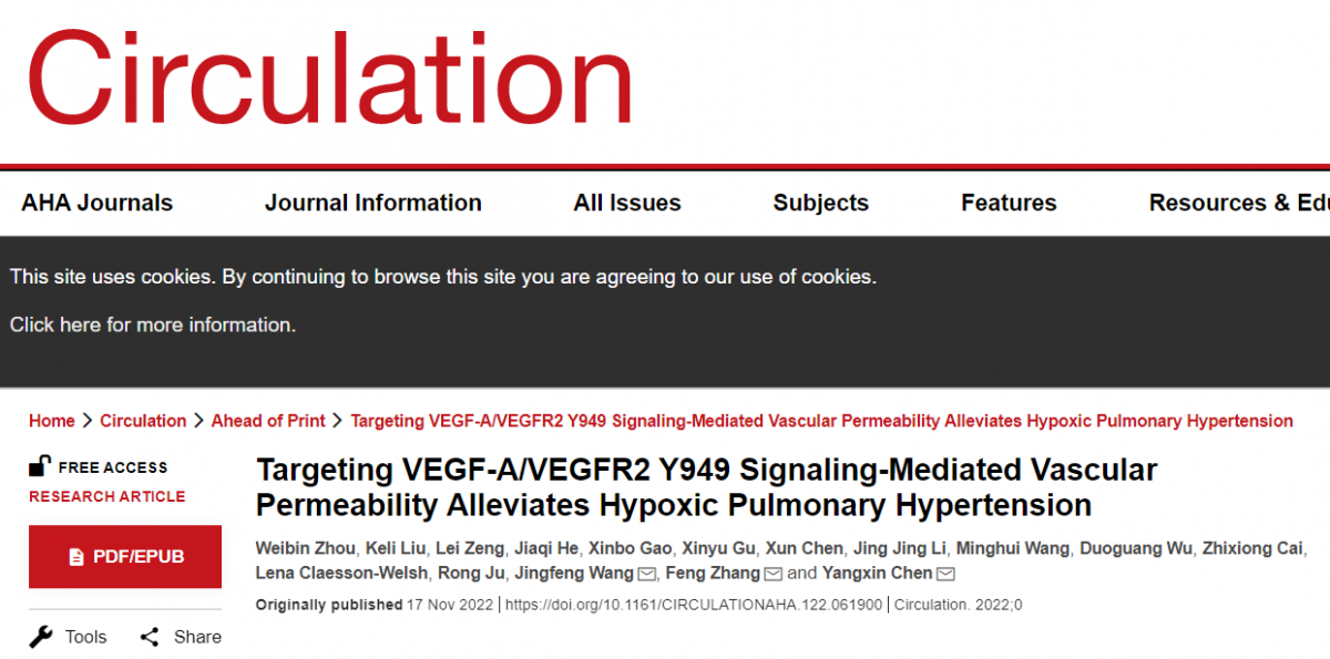2022年11月17日,我院陈样新副院长、王景峰教授,及中山大学中山眼科中心张峰教授团队在Circulation上在线发表了题为“Targeting VEGF-A/VEGFR2 Y949 signaling-mediated vascular permeability alleviates hypoxic pulmonary hypertension”的研究论文,首次揭示肺动脉高压患者和低氧动物模型中被激活的VEGF-A/VEGFR2信号会致使肺血管通透性异常升高,而这一现象依赖于VEGFR2 的Y949磷酸化位点介导的信号轴;通过阻断这一特定信号轴降低血管通透性,可以有效缓解低氧性肺动脉高压。研究同时证实,阻断VEGF-A/VEGFR2的其他信号轴却具有相反作用,揭示VEGF-A/VEGFR2在肺动脉高压发病中具有多面性。总之,该项研究表明,抑制血管渗漏将会使低氧性肺动脉高压患者获益,靶向VEGF-A/VEGFR2 Y949介导的血管通透性可能是一种治疗此类疾病的新策略。