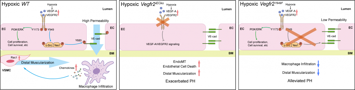 研究发现,当VEGF-A/VEGFR2 Y949/Yes1/c-Src信号轴在低氧性条件下被激活,会诱使血管内皮细胞间连接打开,从而升高血管通透性;随后会使巨噬细胞被募集至肺血管周围,产生炎症反应,并激活平滑肌细胞中Rac1信号介导的细胞迁移和扩增,最终导致肺远端小血管的平滑肌异常覆盖和肺动脉高压表型。通过Vegfr2Y949F点突变选择性阻断这一信号轴可抑制血管通透性,随之减缓这些表型;但完全阻断VEGFR2却会使疾病恶化。