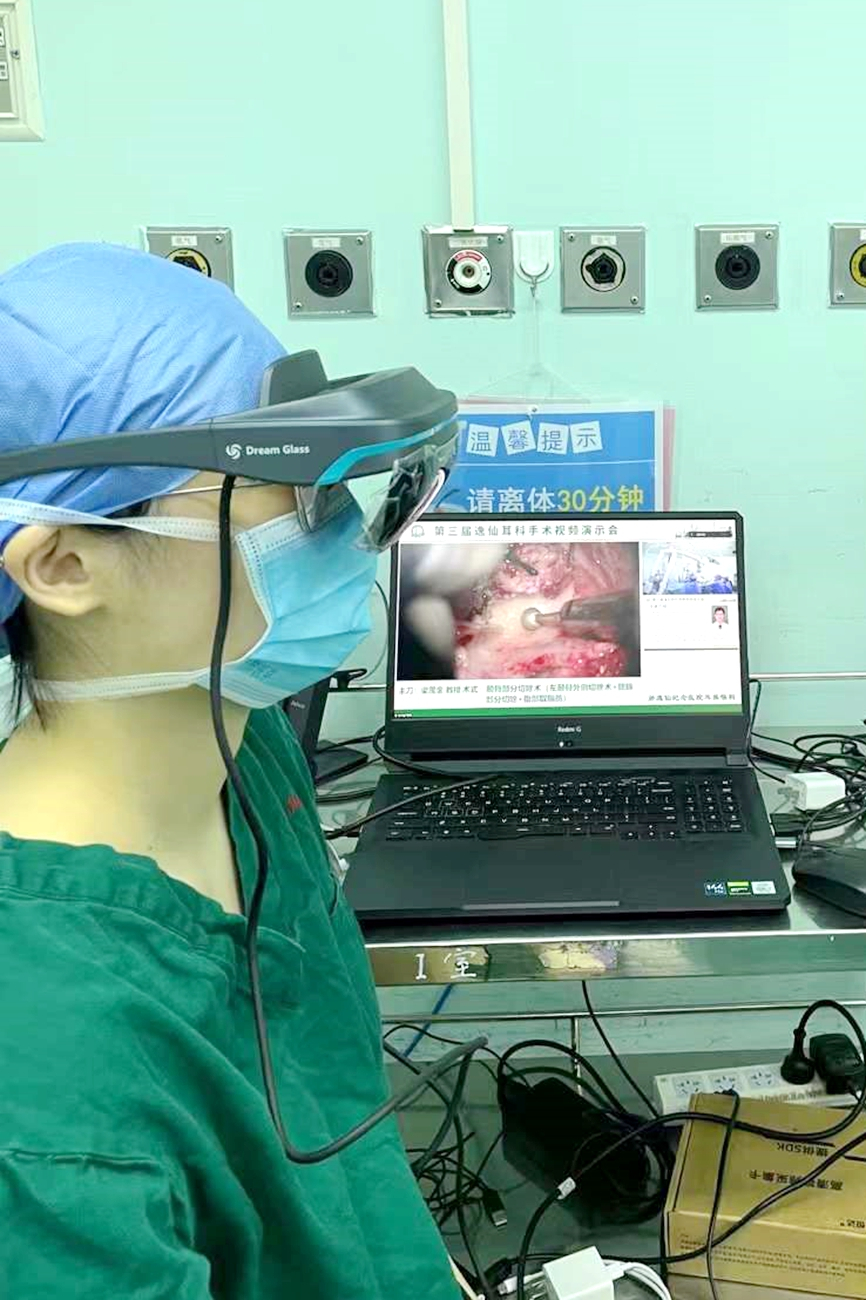 本场演示会还创造性地将增强现实技术(augmented reality,AR)引入手术示教,将手术场景通过AR实景模拟展现出来,学员以主刀的视角参与到手术当中,打造集沉浸、互动为一体的教育实训。这一探索辅助教师优化教学过程,改善以往手术示教情境单调、平面化视觉、操作细节难以全面展示等问题,极大程度上地提高手术示教的教学效率和教学效果。