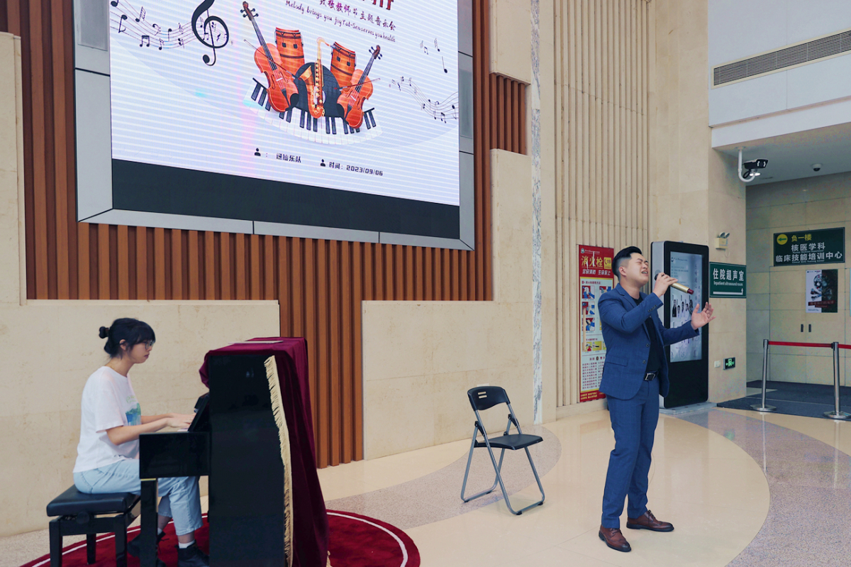 在这个特别日子里,来自医院心内科、核医学科、肾内科等科室的医务工作者脱下白大褂、放下手术刀,拿起麦克风、弹奏起钢琴,通过歌唱、器乐表演等形式庆祝即将到来的教师节,同时希望用音乐带动更多的患者进入音乐的世界,用音乐治愈自己。本届音乐会汇聚了八首经典优美的中国歌曲,囊括了民族乐曲与流行歌曲,既有抒情悠扬的旋律,也有轻快欢乐的节奏。从北宋诗人苏轼的《但愿人长久》,到现代民谣代表作《贝加尔湖畔》,每一首歌曲都令大家耳熟能详,充分体现了中国音乐之美,也表达了医务作者以音乐礼赞教师,表达莘莘学子不忘师恩的心声。