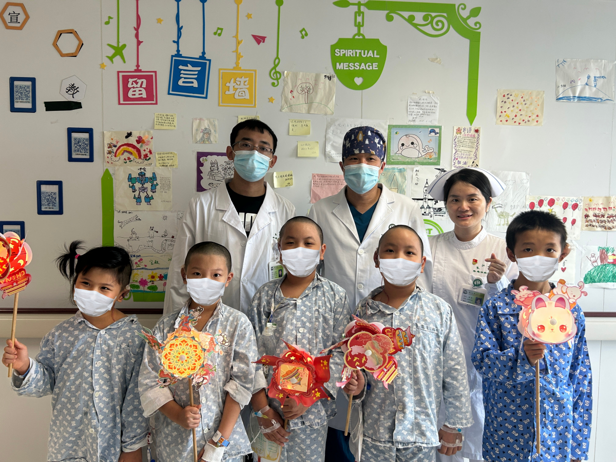 2025年9月22日,在参加了患教会后,志愿者们在花都院区儿科关爱之家教小朋友们亲手制作精美的中秋花灯,并将准备的可爱中秋花灯送到孩子们的手中。一个个造型别致、闪闪发光的花灯,瞬间吸引了孩子们的目光,病房里充满了欢声笑语。工作人员和志愿者们与孩子们亲切交流,鼓励他们勇敢战胜病魔,并向他们及其家属致以最诚挚的节日祝福。