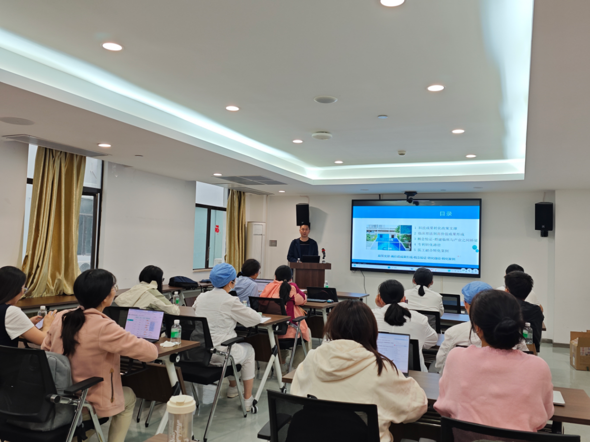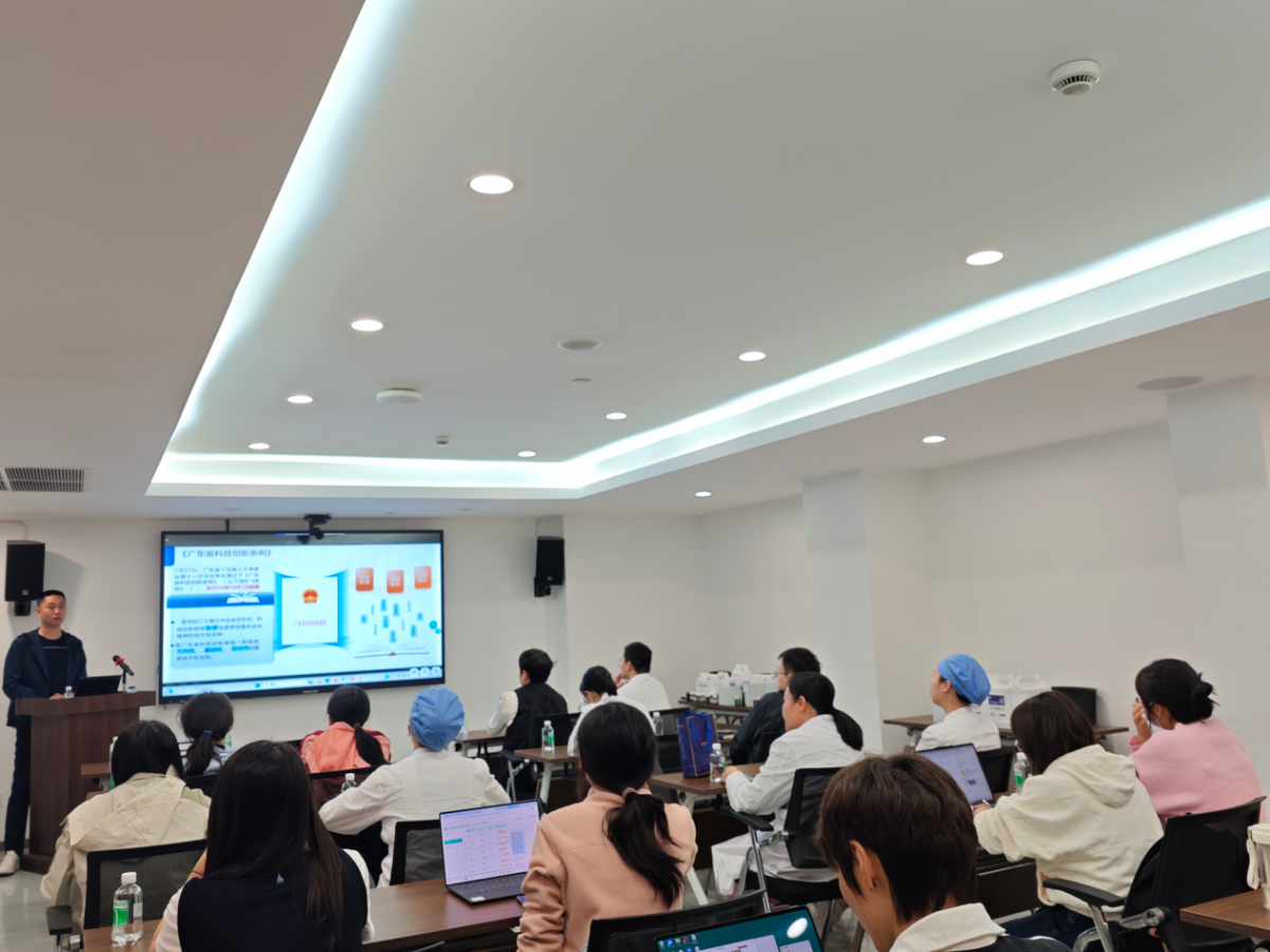 2025 年 10月 23 日,在广东省市场监督管理局(知识产权局)指导、广州商标审查协作中心(广东省知识产权开发与服务中心)支持下,由科研与学科建设部主办的从专利授权到产品开发的成功之路的专题培训讲座在北院区一方长堤810会议室顺利举行。本次讲座特邀广东高校科技成果转化中心高级技术经理人都基铭进行专题讲解,成果转化办公室陈诗颖主持,吸引了院内科研团队、临床医师及研究生等到现场参与。