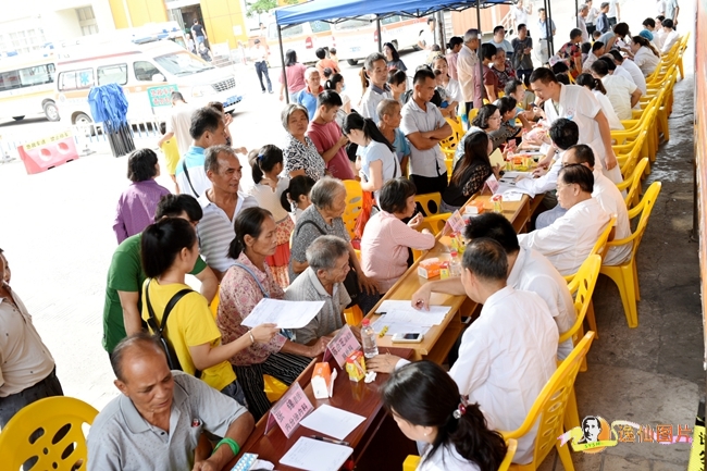 第二天上午八点,义诊活动正式开始。烈日骄阳下,高温也抵挡不了群众的热情,专家教授的义诊摊位前都挤满了闻讯而来的群众。在怀集县人民医院何志新院长的高度重视下,该院唐雄修副院长和医务科苏智友科长在现场协调,义诊现场井然有序。各位专家帮忙看报告、诊病、体查并提供专业意见,同时对当地医生进行现场指导,提供一对一技术帮扶。现场护士进行分诊、测量血压、检测血糖及心电图检查等工作,药师们为开了处方的群众免费配药。当日,义诊医疗队共为当地大约400名群众进行了免费诊病、检查治疗和派药,到场群众都满意而归。