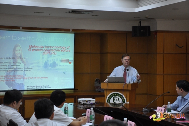 Peter J Little教授首先介绍了G-蛋白偶联受体(GPCRs)与动脉粥样硬化及药物靶点的关系,G-蛋白偶联受体(GPCRs)靶点因占其中受体的绝大多数而备受关注。他用丰富的实验结果和科研事实,为大家揭示了GPCR与糖尿病及动脉粥样硬化这些疾病的关系,并重点提到了Thrombin与G-蛋白偶联受体(GPCRs)的之间关系,开阔了大家的国际科学研究视野。在简短的讨论之后,Peter J Little教授介绍了澳洲的药学教育情况,他从自己的学习工作经历开始,生动地讲解了澳洲的药学教育及药师工作情况,重点介绍了他现在生活和工作的澳大利亚昆士兰大学,让大家充分领略了国际药学大师的讲课风采。