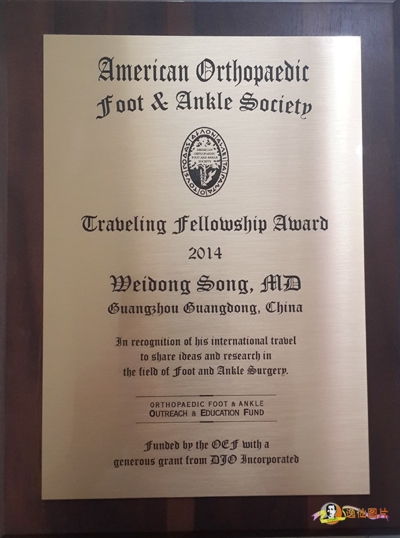 为更好地培养足踝外科人才,增加优秀足踝外科医生之间的交流与协作,美国足踝外科协会(AOFAS)从2005年开始设立游学奖学金(Travelling Fellowship Award),奖励6名来自世界各地优秀的足踝外科医生,为其提供参加足踝外科会议及到美国各地著名足踝中心和大的医疗中心参观学习的机会。在“博济优秀医学人才计划”的培育下,宋卫东医生于2012年及2013年多次参加美国足踝协会的活动,参与、主持及组织多个国际足踝外科会议,同行间良好的交流及协作逐渐获得美国同行的认可,相信这次的获奖作为一个新的起点,在未来为我院、广东地区的足踝外科做出更多的贡献。(文/骨外科)