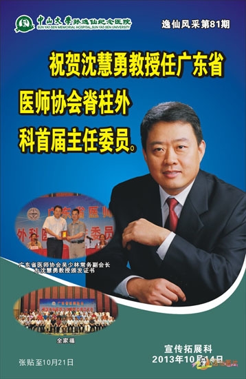 在广东省医师协会脊柱外科医师工作委员会成立大会上,沈慧勇教授荣任广东省医师协会脊柱外科首届主任委员。该工作委员会成立后举办的首次学术会议专题为脊柱骨盆肿瘤,是我国脊柱外科领域规格高、影响较大的脊柱骨盆肿瘤专题研讨会。此次大会共邀请了300余名脊柱外科知名专家出席,包括20多名国内一流脊柱专家,共同探讨脊柱领域的学术进展和行业前景。