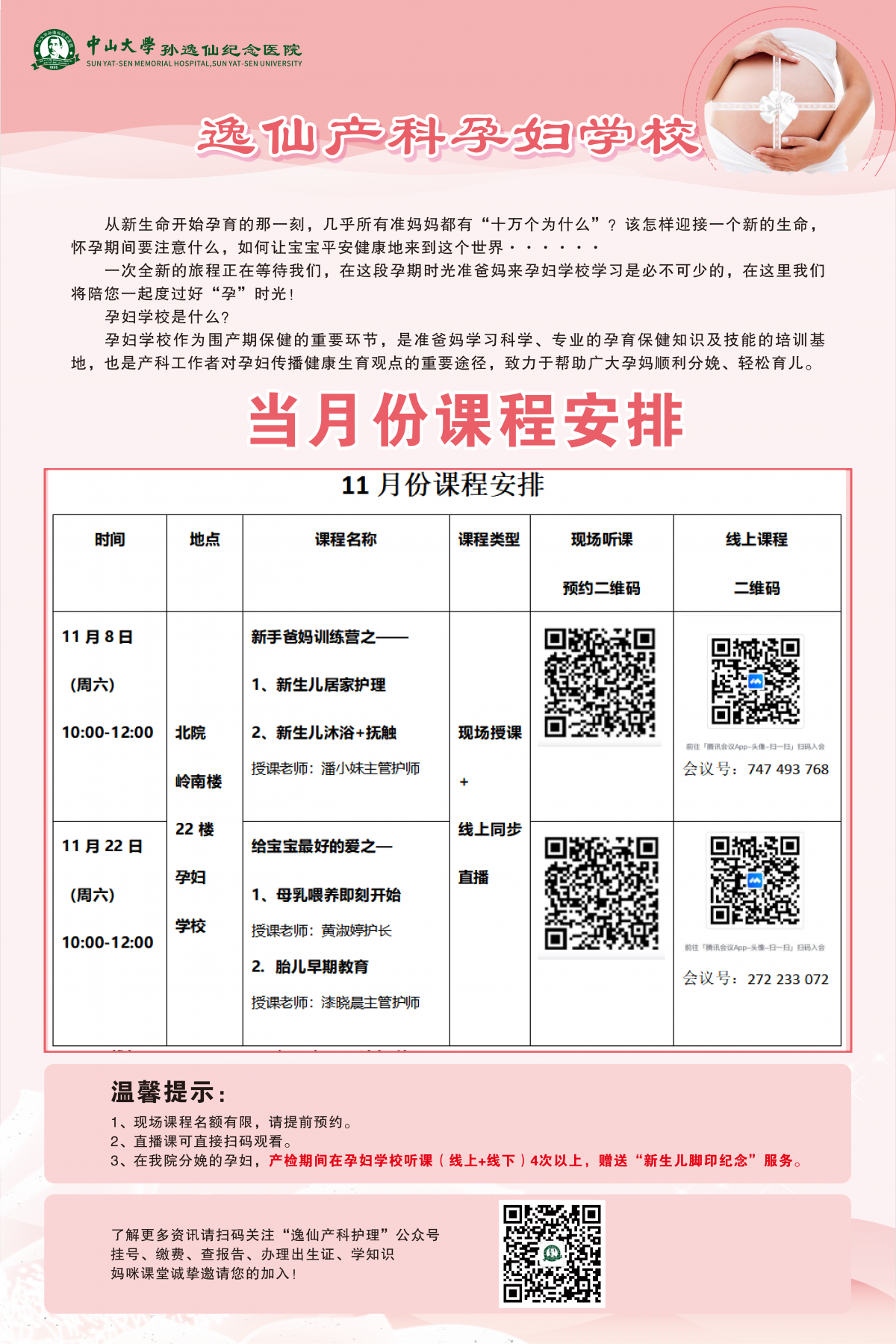 讲座预告 导航痕迹 首页 / 2025年11月份孕妇学校科普讲座安排 2025年11月份孕妇学校科普讲座安排 发布人:护理部 发布日期:2025-10-31 活动时间 2025年11月04日 10:00 - 2025年11月26日 12:00 活动地址 广州市越秀区沿江西路107号中山大学孙逸仙纪念医院岭南楼22楼孕妇学校/线上讲座 社交分享